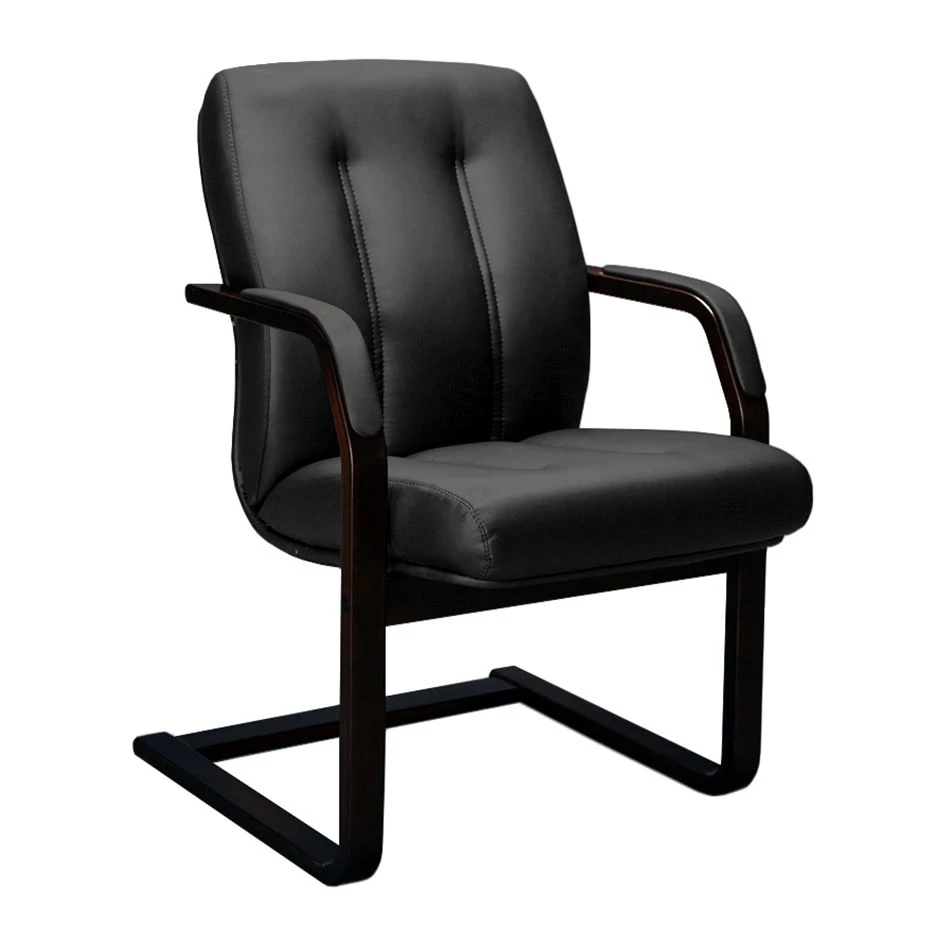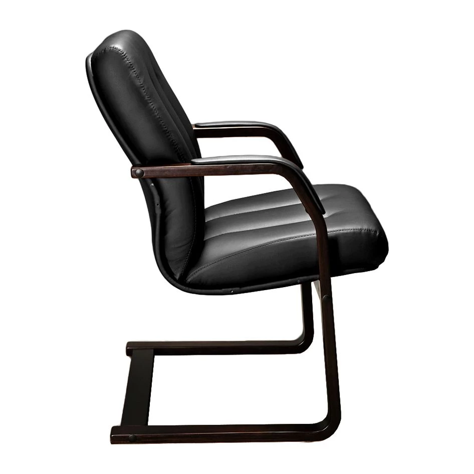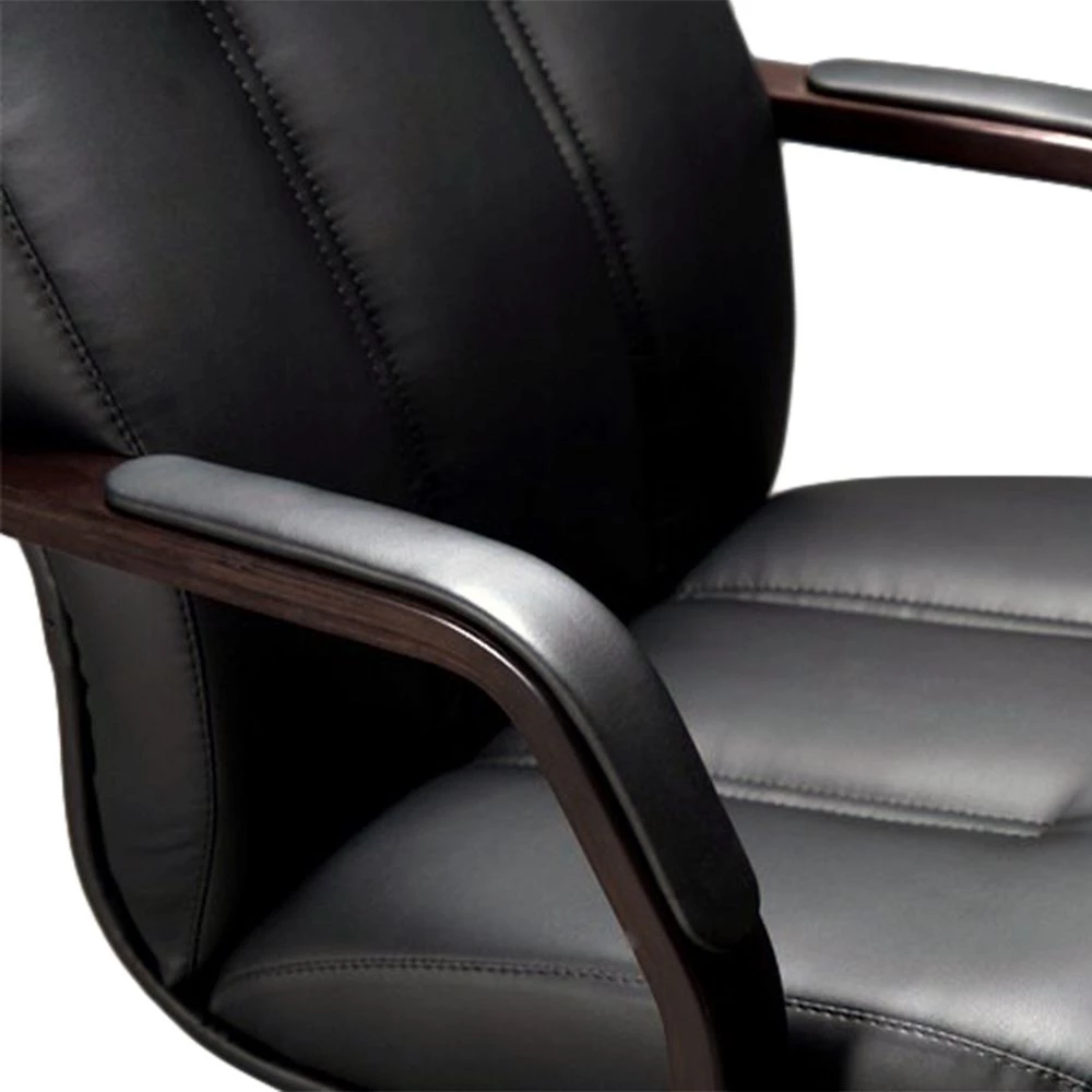 Деревянные подлокотники для повышения комфортабельности имеют мягкие накладки из экокожи, человеку будет комфортно ожидать приема или участвовать в конференции. Продольная строчка служит не только декоративным элементом, но и обеспечивает удобную посадку, не давая телу менять положение.